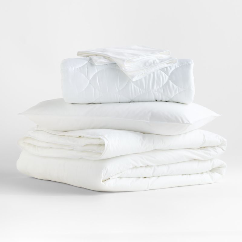 Everything you need to make a classic—and hypoallergenic—bed. Begin by layering on plush comfort with our quilted mattress pad that cushions you with generous fill. Ideal for most sleepers, seasons and climates, our medium-weight duvet inert gets its loft and drape from fluffy recycled fiber. Covered in organic cotton with a soft hand feel, the medium bed pillows boast supportive hypoallergenic filling. Shield the pillows with a pair of organic cotton protectors with a beautiful sateen finish. Outfit all of your bedrooms with the essentials in our Classic bedding collection.