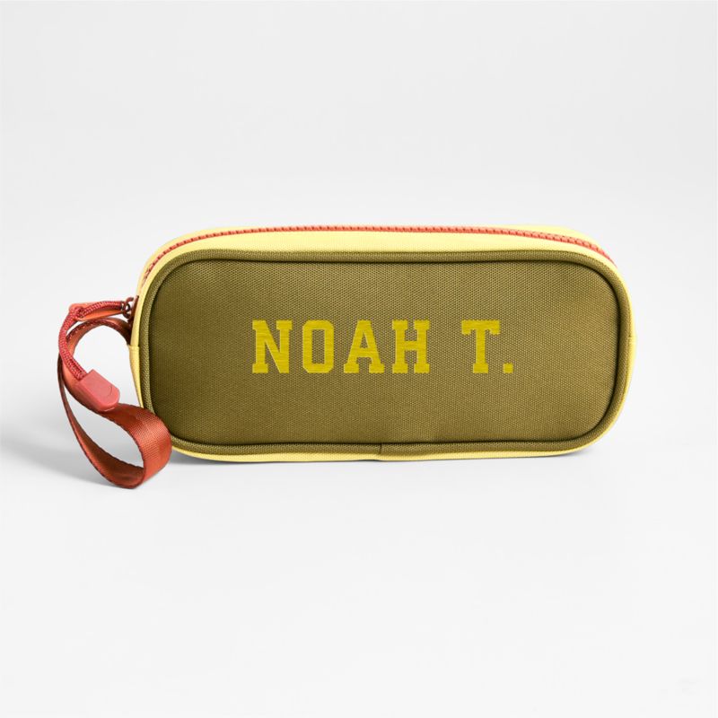 A fun pencil case that's built to handle all the thrills of the day. Our olive green bag has a contrasting zipper, zipper pull and loop handle for the perfect finish. Constructed of supremely durable polyester (that includes recycled plastic bottles), the roomy, easy-clean case makes it simple to keep pens and pencils organized and accessible. Pair with the matching lunch box and backpack for a totally coordinated look.