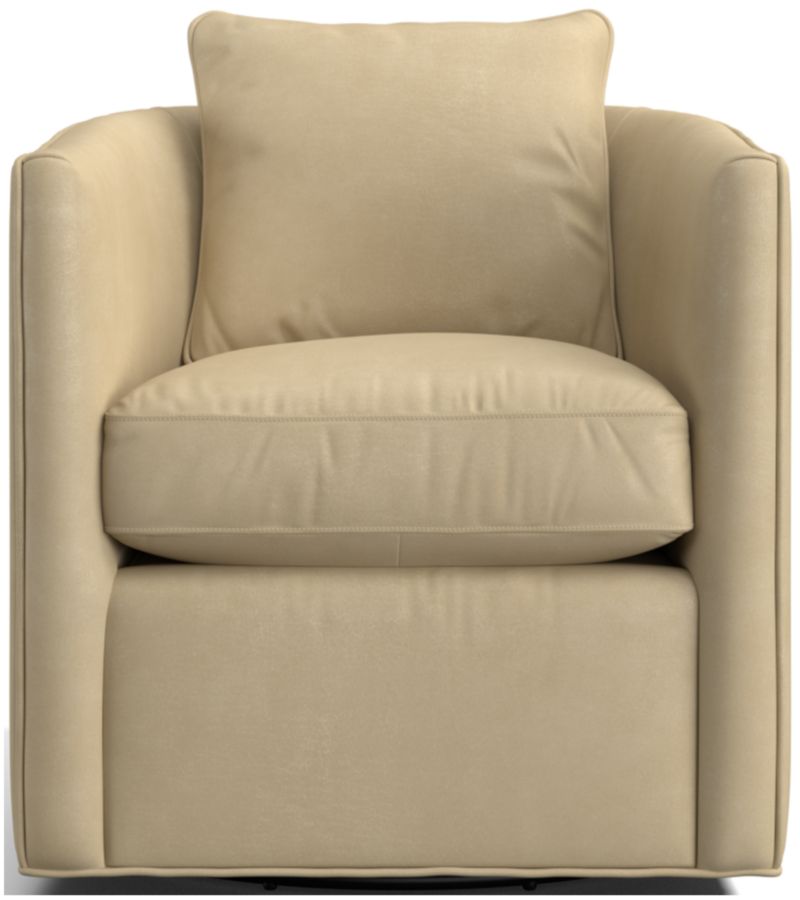 Tailored with easy-to-live-with leather, our Drew swivel chair has all the right moves. Shaped with the embrace of a barrel back, the chair indulges with a cushioned seat and throw pillow. The rustic, distressed leather speaks to life on the range with natural markings and a light coat of wax to lend a smooth hand. Perfectly proportioned for use in pairs, Drew is a great choice for multitasking apartments, media rooms or conversational corners in the living room.