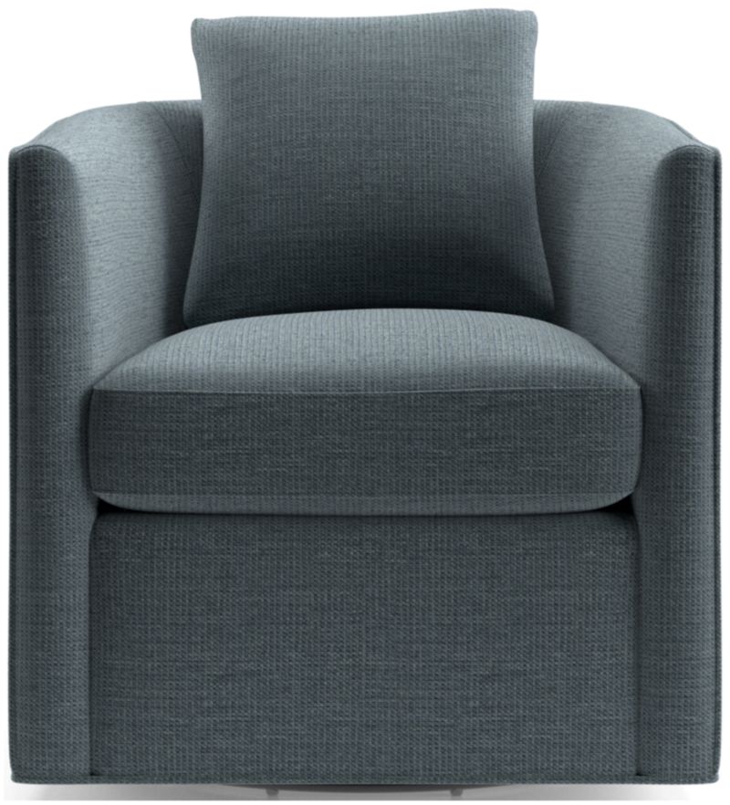 Crisply tailored with self welting, our Drew swivel chair has all the right moves. Shaped with the embrace of a barrel back, the chair indulges with cushioned seat and throw pillow. Perfectly proportioned for using in pairs or more, Drew is a great choice for multi-tasking apartments, media rooms or conversational corners in the living room. The Drew Small Swivel Chair is a Crate and Barrel exclusive.