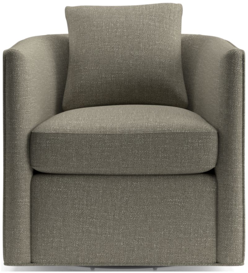 Crisply tailored with self welting, our Drew swivel chair has all the right moves. Shaped with the embrace of a barrel back, the chair indulges with cushioned seat and throw pillow. Perfectly proportioned for using in pairs or more, Drew is a great choice for multi-tasking apartments, media rooms or conversational corners in the living room. The Drew Small Swivel Chair is a Crate and Barrel exclusive.