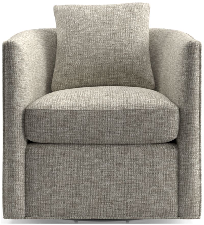 Crisply tailored with self welting, our Drew swivel chair has all the right moves. Shaped with the embrace of a barrel back, the chair indulges with cushioned seat and throw pillow. Perfectly proportioned for using in pairs or more, Drew is a great choice for multi-tasking apartments, media rooms or conversational corners in the living room. The Drew Small Swivel Chair is a Crate and Barrel exclusive.