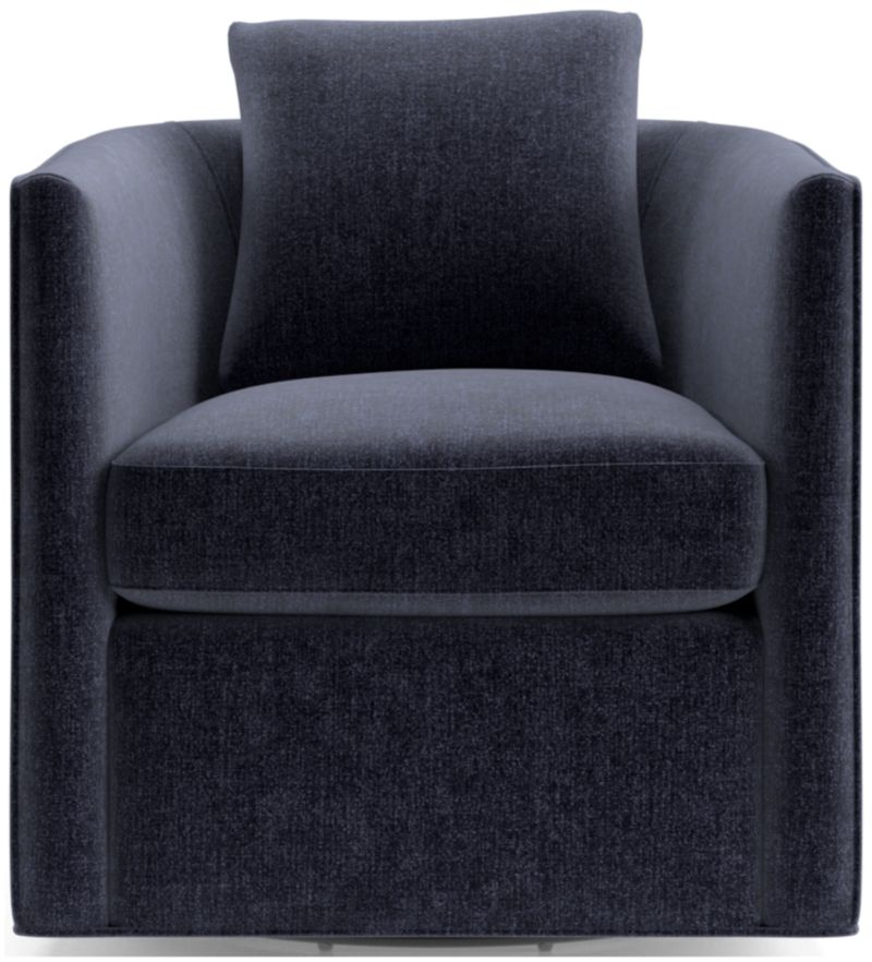 Crisply tailored with self welting, our Drew swivel chair has all the right moves. Shaped with the embrace of a barrel back, the chair indulges with cushioned seat and throw pillow. Perfectly proportioned for using in pairs or more, Drew is a great choice for multi-tasking apartments, media rooms or conversational corners in the living room. The Drew Small Swivel Chair is a Crate and Barrel exclusive.