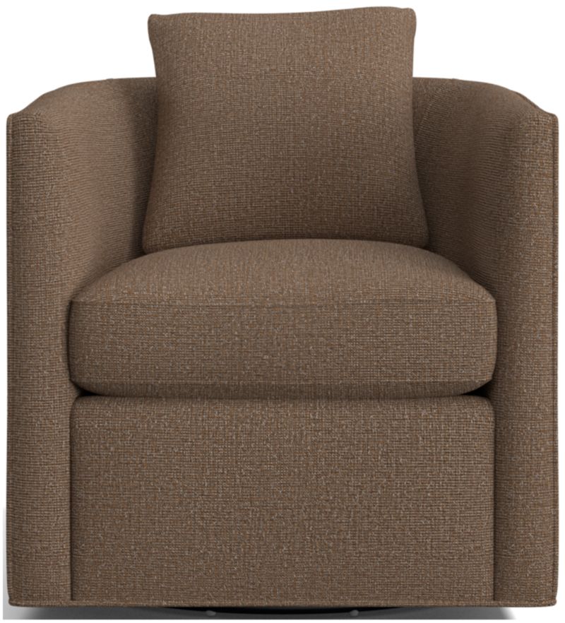 Crisply tailored with self welting, our Drew swivel chair has all the right moves. Shaped with the embrace of a barrel back, the chair indulges with cushioned seat and throw pillow. Perfectly proportioned for using in pairs or more, Drew is a great choice for multi-tasking apartments, media rooms or conversational corners in the living room. The Drew Small Swivel Chair is a Crate and Barrel exclusive.