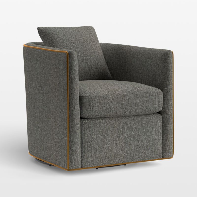 Crisply tailored with jaunty contrast welting, our Drew swivel chair has all the right moves. Shaped with the embrace of a barrel back, the chair indulges with cushioned seat and throw pillow. Perfectly proportioned for using in pairs or more, Drew is a great choice for multi-tasking apartments, media rooms or conversational corners in the living room. The Drew Small Swivel Chair is a Crate and Barrel exclusive.