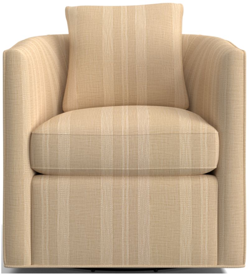 Crisply tailored with jaunty contrast welting, our Drew swivel chair has all the right moves. Shaped with the embrace of a barrel back, the chair indulges with a supportive and comfortable cushioned seat and throw pillow at the back. Perfectly proportioned for use in pairs, Drew is a great choice for multi-tasking apartments, media rooms or conversational corners in the living room. We love the subtle dimension and linen-like feel our striped Strata fabric brings to the clean-lined chair.