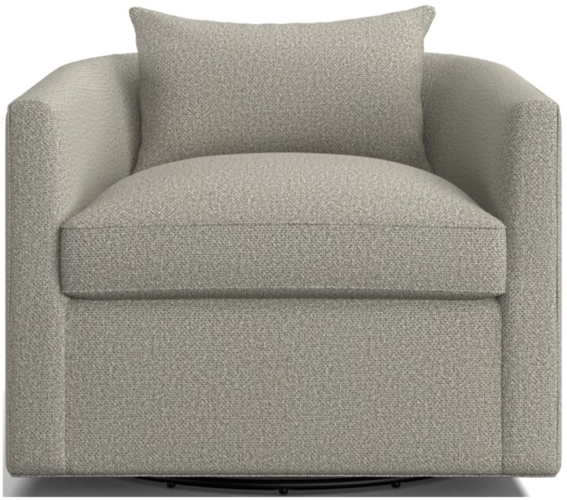 Crisply tailored with self welting, our Drew swivel chair has all the right moves. Generously sized for a roomy sit, the barrel-back chair indulges with a cushioned seat and throw pillow. Alone or as a pair, Drew is a great choice for multi-tasking apartments, media rooms or conversational corners in the living room.