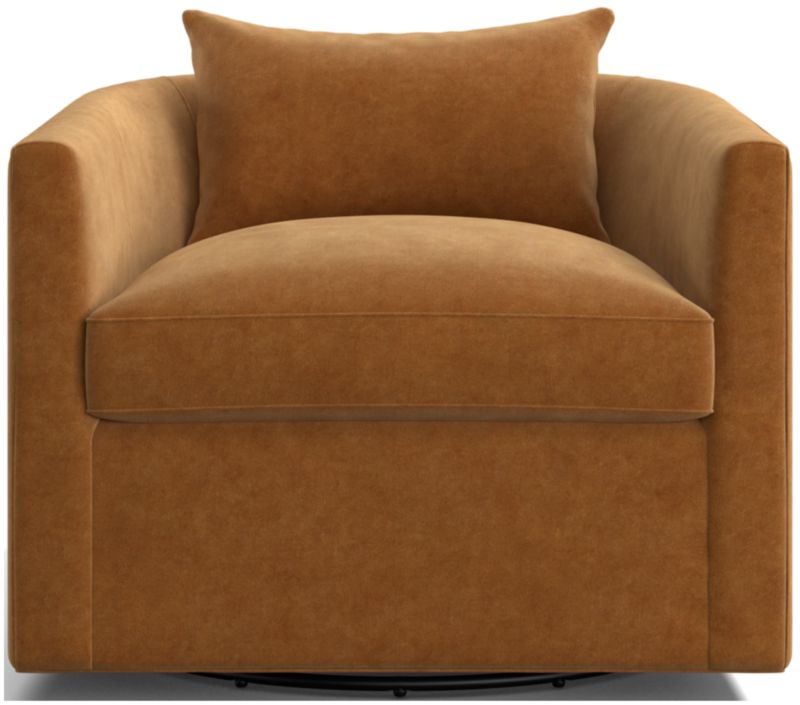 Crisply tailored with self welting, our Drew swivel chair has all the right moves. Generously sized for a roomy sit, the barrel-back chair indulges with a cushioned seat and throw pillow. Alone or as a pair, Drew is a great choice for multi-tasking apartments, media rooms or conversational corners in the living room.