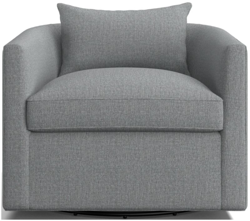 Crisply tailored with self welting, our Drew swivel chair has all the right moves. Generously sized for a roomy sit, the barrel-back chair indulges with a cushioned seat and throw pillow. Alone or as a pair, Drew is a great choice for multi-tasking apartments, media rooms or conversational corners in the living room.