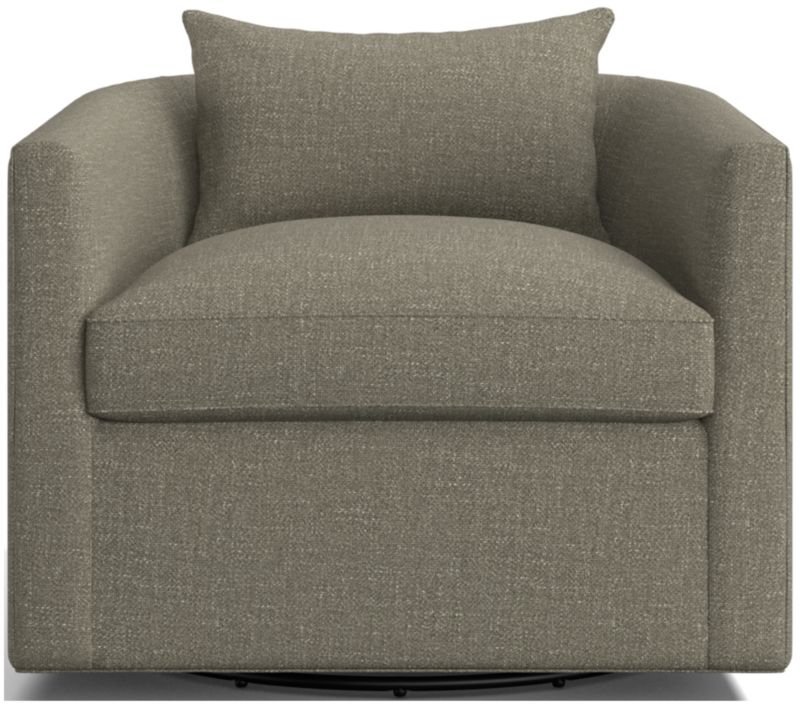 Crisply tailored with self welting, our Drew swivel chair has all the right moves. Generously sized for a roomy sit, the barrel-back chair indulges with a cushioned seat and throw pillow. Alone or as a pair, Drew is a great choice for multi-tasking apartments, media rooms or conversational corners in the living room.