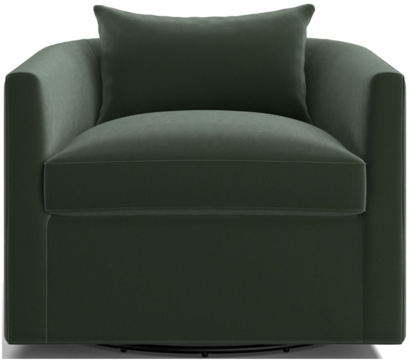 Crisply tailored with self welting, our Drew swivel chair has all the right moves. Generously sized for a roomy sit, the barrel-back chair indulges with a cushioned seat and throw pillow. Alone or as a pair, Drew is a great choice for multi-tasking apartments, media rooms or conversational corners in the living room.