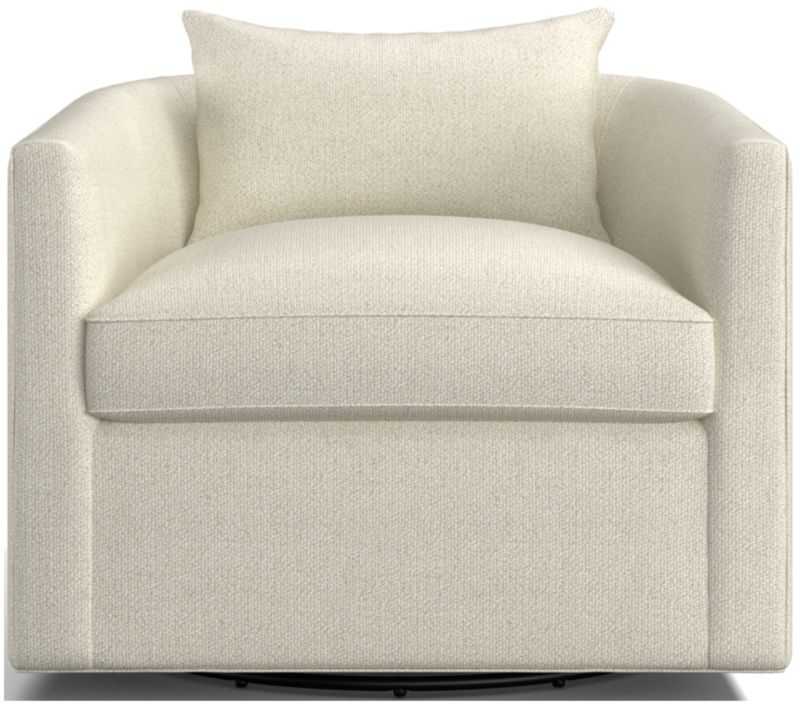 Crisply tailored with self welting, our Drew swivel chair has all the right moves. Generously sized for a roomy sit, the barrel-back chair indulges with a cushioned seat and throw pillow. Alone or as a pair, Drew is a great choice for multi-tasking apartments, media rooms or conversational corners in the living room.