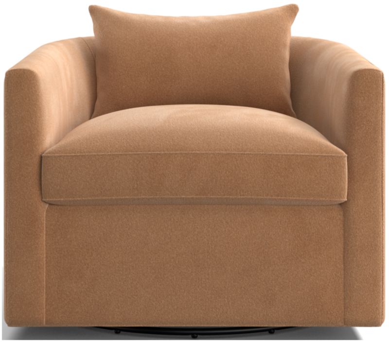 Crisply tailored with self welting, our Drew swivel chair has all the right moves. Generously sized for a roomy sit, the barrel-back chair indulges with a cushioned seat and throw pillow. Alone or as a pair, Drew is a great choice for multi-tasking apartments, media rooms or conversational corners in the living room.