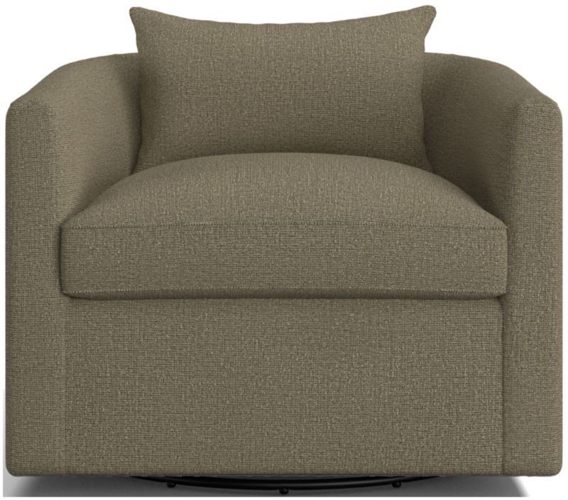 Crisply tailored with self welting, our Drew swivel chair has all the right moves. Generously sized for a roomy sit, the barrel-back chair indulges with a cushioned seat and throw pillow. Alone or as a pair, Drew is a great choice for multi-tasking apartments, media rooms or conversational corners in the living room.