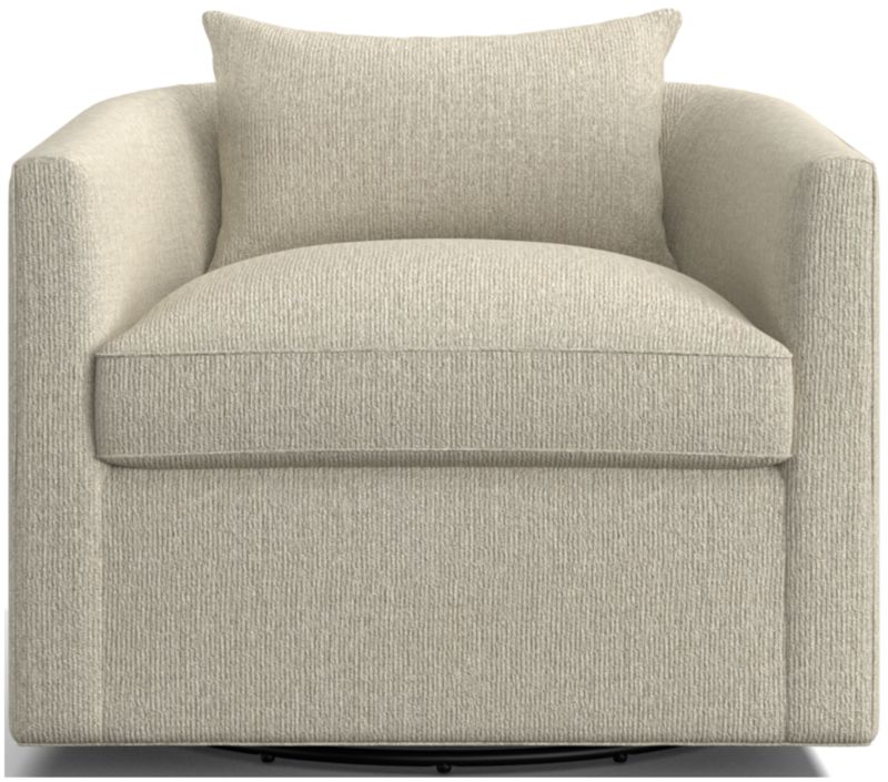 Crisply tailored with self welting, our Drew swivel chair has all the right moves. Generously sized for a roomy sit, the barrel-back chair indulges with a cushioned seat and throw pillow. Alone or as a pair, Drew is a great choice for multi-tasking apartments, media rooms or conversational corners in the living room.