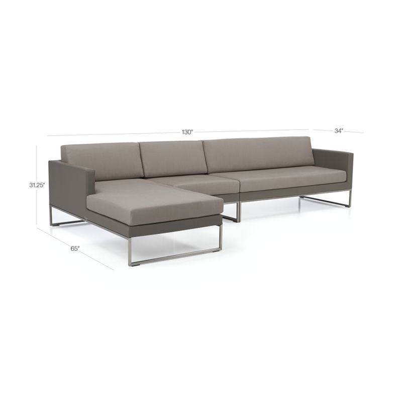 The outdoor sectional's left arm chaise , armless chair and right arm loveseat are handcrafted with linear, outdoor-grade stainless steel frames upholstered in synthetic mesh. Fade-, mold-, tear- and stain-resistant mesh supports a cushion covered in weather-resistant Sunbrella acrylic on each piece . The Dune Taupe 3-Piece Left Arm Chaise Sectional Sofa with Sunbrella ® Cushions is a Crate and Barrel exclusive.