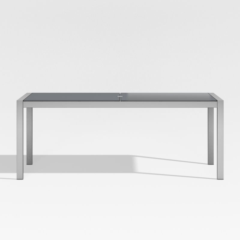 Table has an umbrella opening and seats up to six. The Dune Outdoor Rectangular Dining Table with Charcoal Glass Top is a Crate and Barrel exclusive.