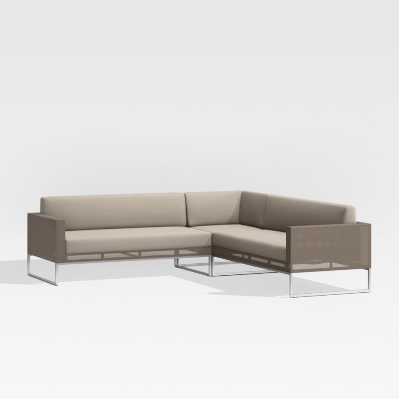 Fade-, mold-, tear- and stain-resistant mesh supports element-enduring cushions in Sunbrella acrylic on the left arm loveseat, right arm loveseat and corner. The Dune Taupe 3-Piece Sectional Sofa with Sunbrella ® Cushions is a Crate and Barrel exclusive.
