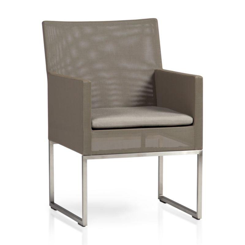 Frame is precisely mitered at the corners, welded, ground and hand-buffed to a seamless appearance. Coordinating Sunbrella cushion is weather-resistant, rain or shine. The Dune Taupe Dining Chair with Sunbrella ® Cushion is a Crate and Barrel exclusive.