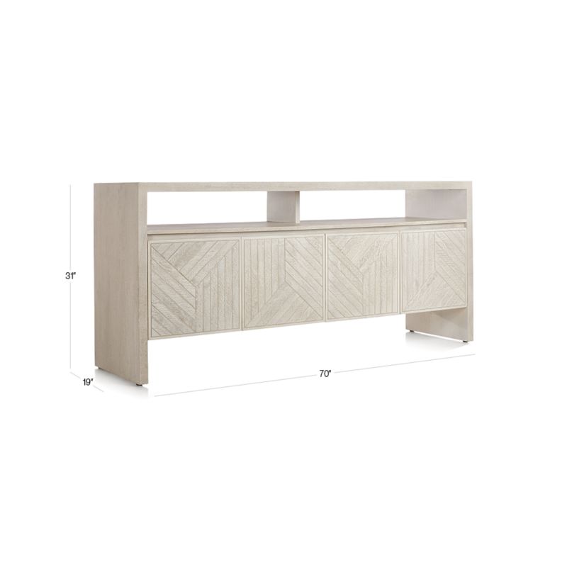 Employing the time-honored technique of parquetry, skilled woodworkers add artisan rusticity to our clean, contemporary Dunewood credenza. Bringing geometric complexity to the credenza's flat-front doors, each piece of mango wood is carefully cut and inlaid by hand to create a modern mosaic of angled lines. A wash of white and a light distressing add a whisper of color and texture to enhance this striking credenza's sculptural presence. Designed by Blake Tovin of Tovin Design, the credenza features an open shelf and two interior shelves.