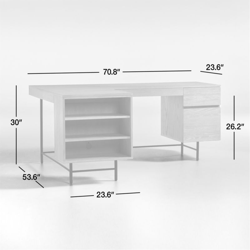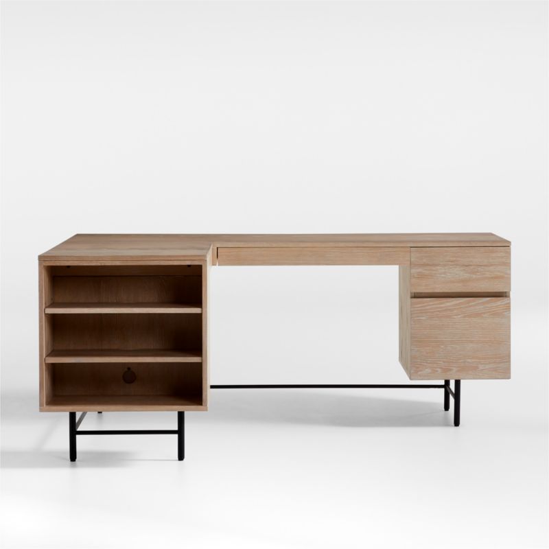 Our asymmetrical Dunn desk tucks into the corner to make the most of your home office space. Full of function and storage, the L-shaped desk angles a spacious work surface with stacked drawers for supplies and files as well as an integrated bookshelf. Two flat-front pencil drawers add to the desk's clean lines. Made of oak veneer, the desk has an ivory ceruse finish that makes the most out of the wood's expressive grain. To keep the look light, the desk stands on a slim, minimalist base of tubular metal. The Dunn oak desk is a Crate & Barrel exclusive.