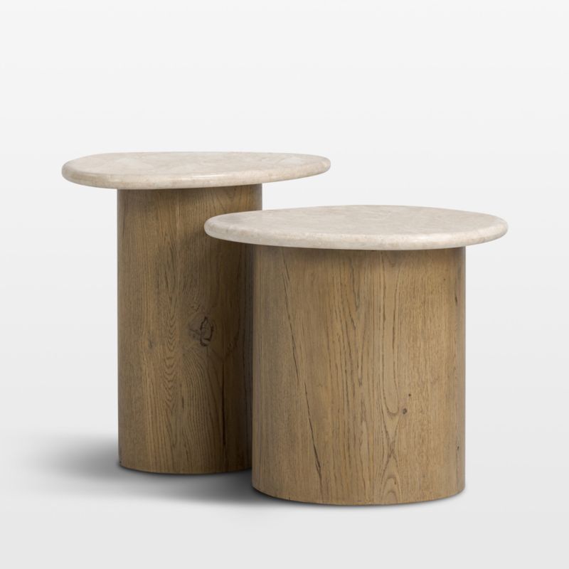 Oak and marble are the perfect materials to express the organic curves of this set of nesting tables. Cylindrical pedestals rise tall, paneled in a seamless flow of oak highlighted with a natural rubbed finish to bring out the character of the wood. Made of taupe marble, the freely shaped marble tops add to the set's organic allure. As a nesting pair, the tables offer two tiers of surface area. They can also be positioned throughout the room as accent tables.