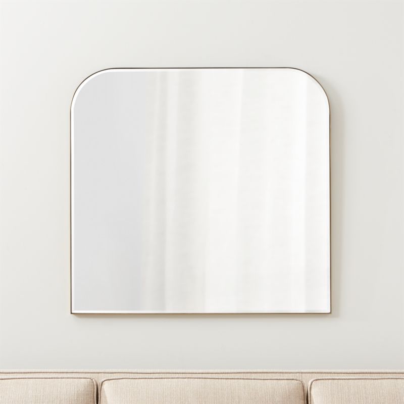 Edged with a slim brass band, this minimalist wall mirror curves a subtle arch of modern elegance. A Crate & Barrel exclusive, its reflective beveled glass creates delicate interest. With its brass-finish stainless steel frame, the arched wall mirror is an understated essential in any room and is safe to hang in bathrooms. Group with our Edge round, capsule, and rounded rectangle floor and wall mirrors in brushed nickel, brass and gunmetal to create an intriguing geometric display.