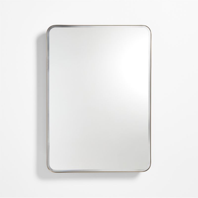 Edged with a slim brass band, our mirrored cabinet curves a rounded rectangle for a modern and elegant silhouette. Made of brass-finished stainless steel, the clean-lined medicine cabinet provides a mirrored glass door that opens to three shelves. Able to be recess mounted or affixed to the wall, the large brass medicine cabinet complements bathrooms with its contemporary, minimalist style.