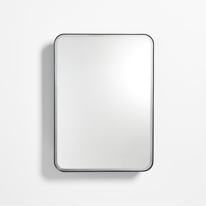 Edged with a slim black band, our mirrored cabinet curves a rounded rectangle for a modern and elegant silhouette. Made of black-finished stainless steel, the clean-lined medicine cabinet provides a mirrored glass door that opens to three adjustable shelves. Able to be recess mounted or affixed to the wall, the small black medicine cabinet complements bathrooms with its contemporary, minimalist style.