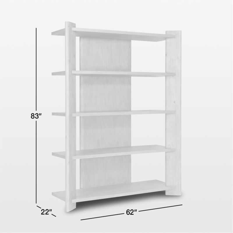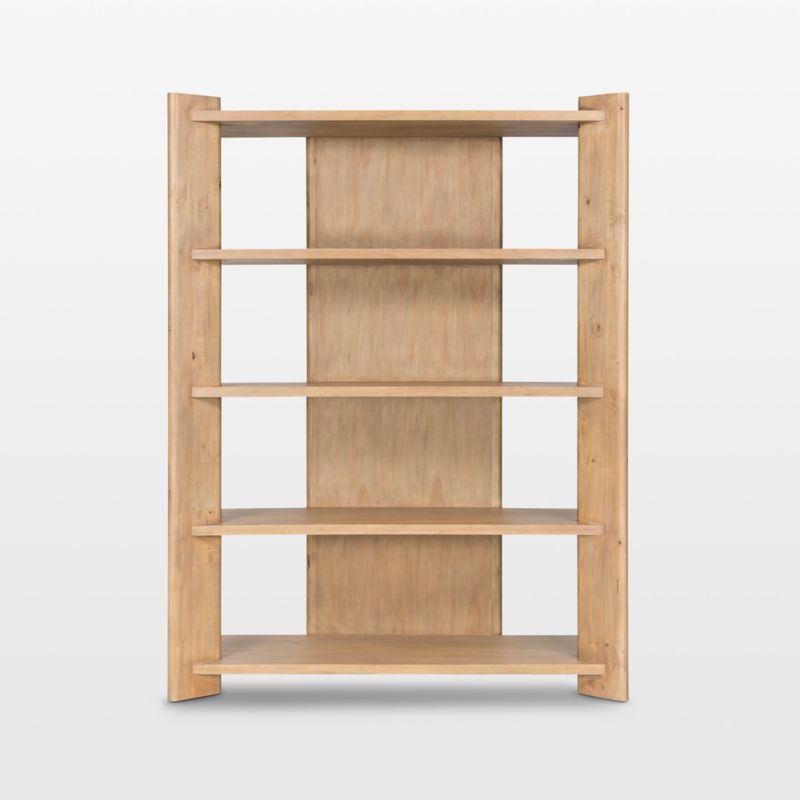 Solid pine shows off its glorious grain in our grandly scaled Edmund bookcase. Framing five fixed shelves, wide planks angle out to showcase books, collectibles and framed photos. Open spaces flanking the broad central back panel, rounded edges and a smoked finish keep the bookcase looking casual, light and airy.