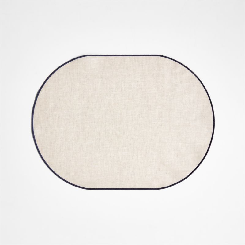 Our two-sided placemat has you covered for fancy dinners as well as casual meals. Made of natural linen, the oval placemat is rimmed on each side with navy blue merrow stitching. For a more formal look, the untreated side offers the pleasing texture of linen. For everyday meals where things might get messy, opt for the side treated with a clear coating that resists spills and allows for easy clean up.