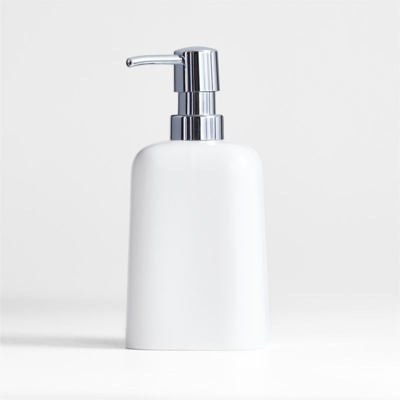 Durable porcelain shapes our Eli soap pump, curving a rounded, tapered square. A semi-matte white glaze coats the vessel with a fresh, clean finish, and a chrome pump adds gleaming contrast. Designed to blend in with any bathroom decor, this minimal and modern collection pairs especially harmoniously with our Eli vanities.