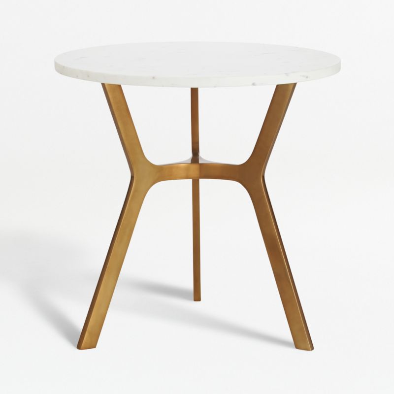Inspired by mid-century modern design, the Elke end table's sculptural cast base takes a refined architectural stance. Topped with a round top of white marble, the hand-cast aluminum base is has a wishbone-shaped design and warm, polished brass finish with a touch of antiquing. The Elke Round Marble End Table with Brass Base is a Crate and Barrel exclusive.