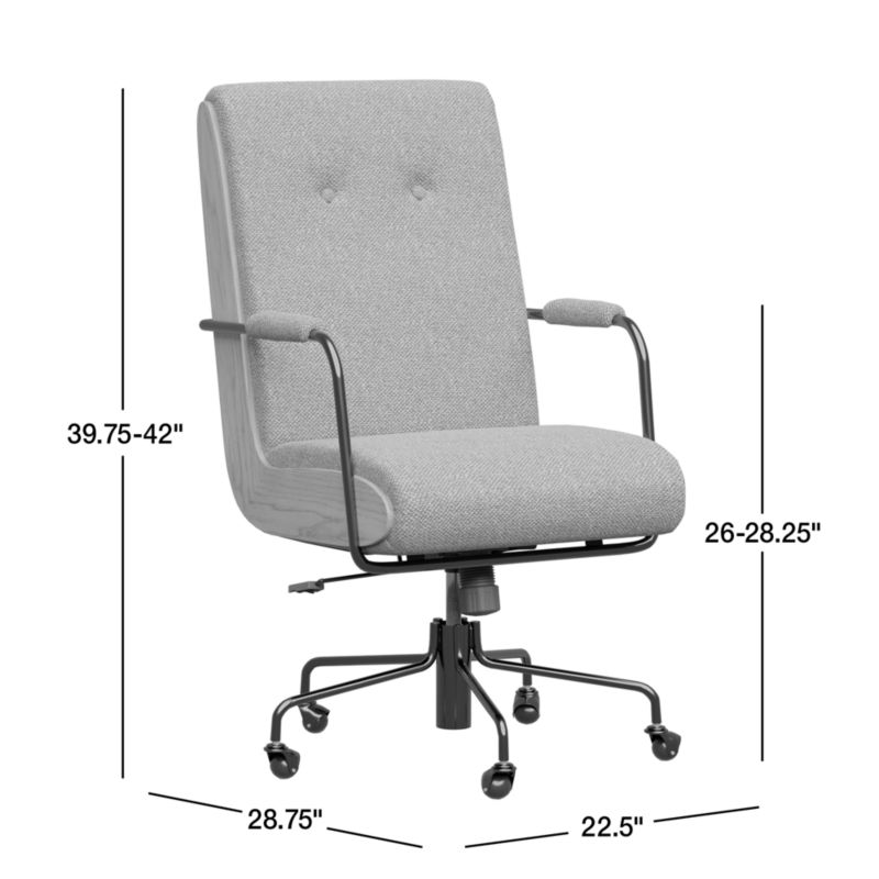 A modern mix of materials in a vintage-inspired design. The Ellison office chair flows padded cushioning from the button-tufted high back to the roll-edge seat. Boomerang-shaped side panels show off the beautiful grain of oak veneer, while brushed brass-finished tubing wraps behind the back and under the seat to create slim padded armrests. Adjusting for height and rolling about on caster wheels, the office chair makes its rounds in the home office or library.