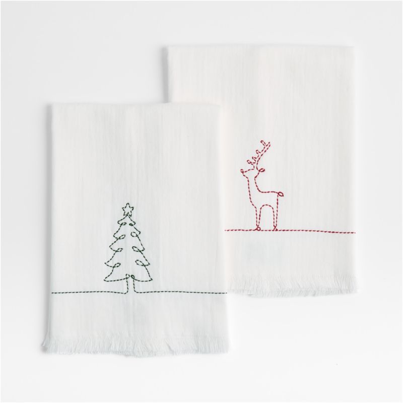 Our holiday-themed guest towel reimagines a popular holiday icon for a look that's festive yet contemporary. A single Christmas tree is fancifully rendered with a continuous line of green embroidery against a snow-white backdrop. Made of absorbent terrycloth, the hand towel pairs with our Holiday Reindeer towel for a red and green combo that brings seasonal cheer to a powder room or guest bathroom.