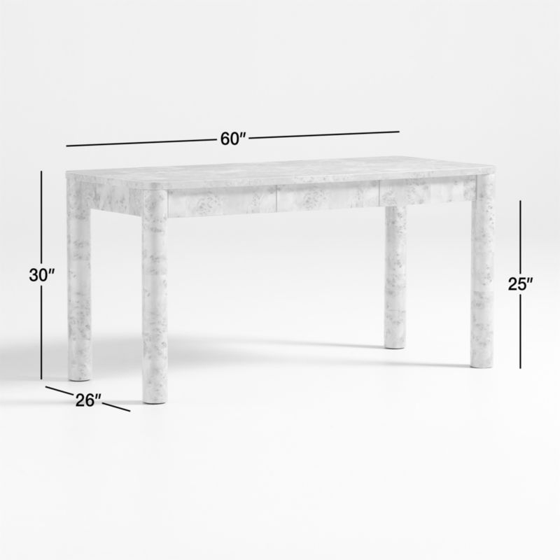 Our Emerson desk's clean lines and seamless woodworking let the intriguing, one-of-a-kind markings of burl wood be the star. Harvested from naturally occuring growths on poplar trees, mappa burl wood is peppered with tight clusters that give it a decorative appearance. Inspired by a vintage European style, the polished design flows columnar legs into the top and flawlessly integrates three drawers into the apron.