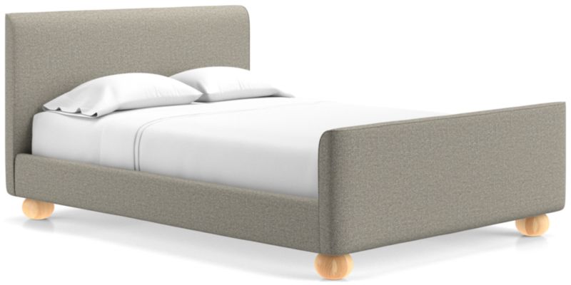 Kids will rest easy in this contemporary, low-profile Emery Upholstered Bed that's sculpted with curved waterfall edges on the headboard and footboard. It's upholstered in classic twill for a soft, comfy feel that's perfect for snuggling up during bedtime stories. The stain-resistant, highly durable polyester fabric cleans up beautifully, making it ideal for active kid spaces. Piping trim and natural wood bun feet add an extra dash of personality to the modern design. With its clean lines and neutral, goes-with-anything cafe tan hue, the versatile style will smoothly transition from little-kid to big-kid room.