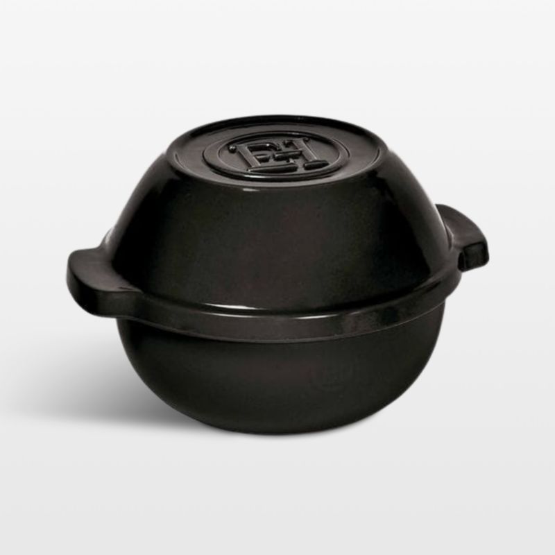 Bake dreamy artisanal loaves of sourdough, maple-pecan or no-knead bread with this versatile baking dish from Emile Henry. Crafted of clay from the Burgundy region of France, the lidded bread loaf baker creates the ideal conditions for baking bread. The spherical shape and ceramic construction diffuse heat gently for perfect results. Glazed fade-resistant black, the lidded pan does double duty cooking vegetables and more on the stove or grill—just flip every 15 minutes for even browning.