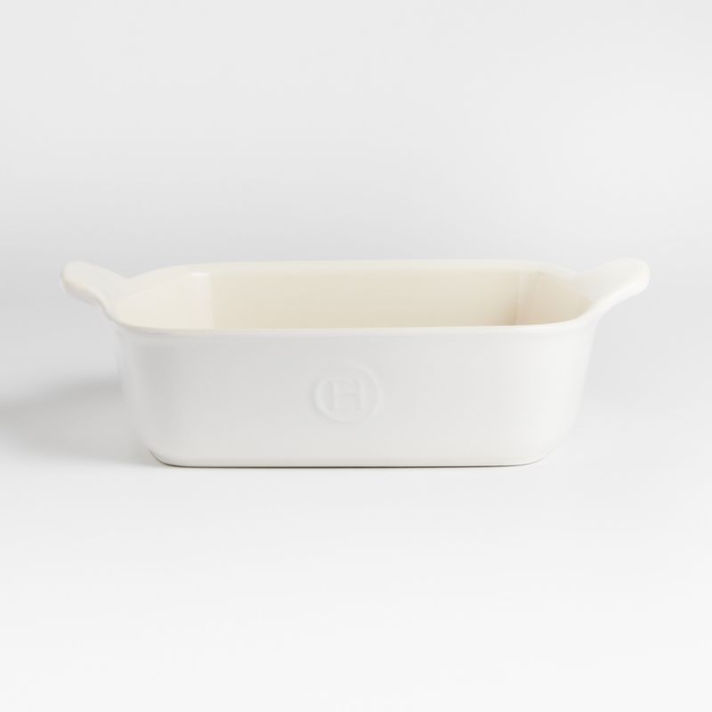 Glazed a bright white inspired by sugar, this baking dish makes an elegant presentation of cinnamon rolls, broccoli gratin and pear crumble. Detailed with graceful handles and a creamy interior, the square baker is scaled deep to prevent spillover and accommodate layered and cheesy recipes. Emile Henry's signature ceramic resists chips, cracks and shocks and stands up to slicing, daily use, temperature fluctuations and dishwashers. Made from high-fired Burgundy clay, the pan diffuses heat gently and evenly for delicious results.