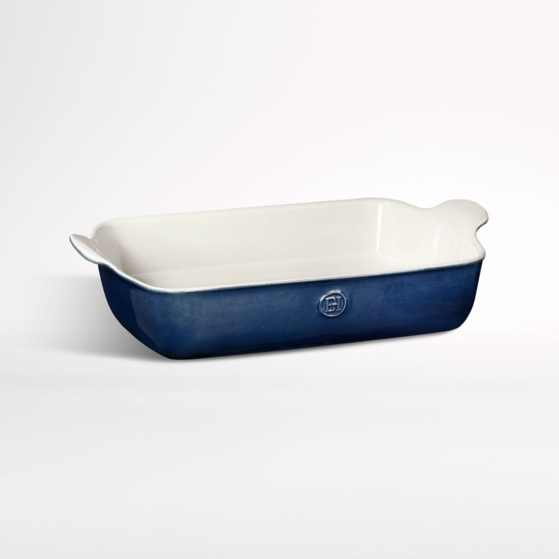 Glazed deep blue, this handsome baking dish makes an elegant presentation of enchiladas, lasagna and pear cobbler. Detailed with streamlined handles and a creamy interior, the glazed baker is scaled deep to prevent spillover and accommodate vegetables and meats for roasting. Made by hand from high-fired Burgundy clay, the ceramic pan diffuses heat gently and evenly for delicious results.