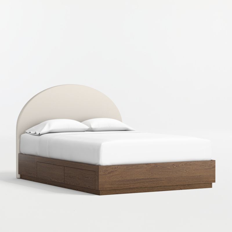 Playful, practical and perfect for the kid's room in every way. Our Emma upholstered storage bed features a whimsical arched headboard wrapped in softly textured upholstery to create a cushy space for reading and dreaming. Underneath, a deep brown wood base with two drawers provides smart, space-saving storage. The mixed-material combo gives it a modern, casual sensibility that works with any decor style, at any age.