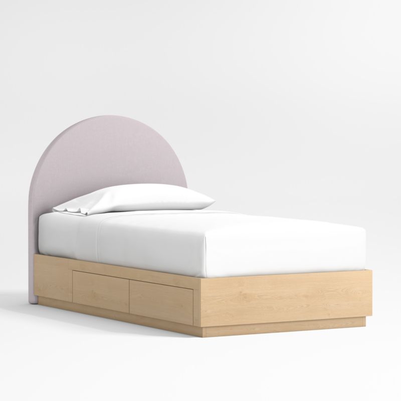 Playful, practical and perfect for the kid's room in every way. Our Emma Upholstered Storage Bed features a whimsical arched headboard wrapped in softly textured lilac upholstery to create a cushy space for reading and dreaming. Underneath, a warm oak base with two drawers provides smart, space-saving storage. The mixed-material combo gives it a fresh, casual sensibility that works with any decor style, at any age.