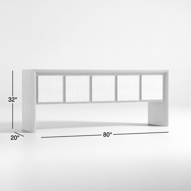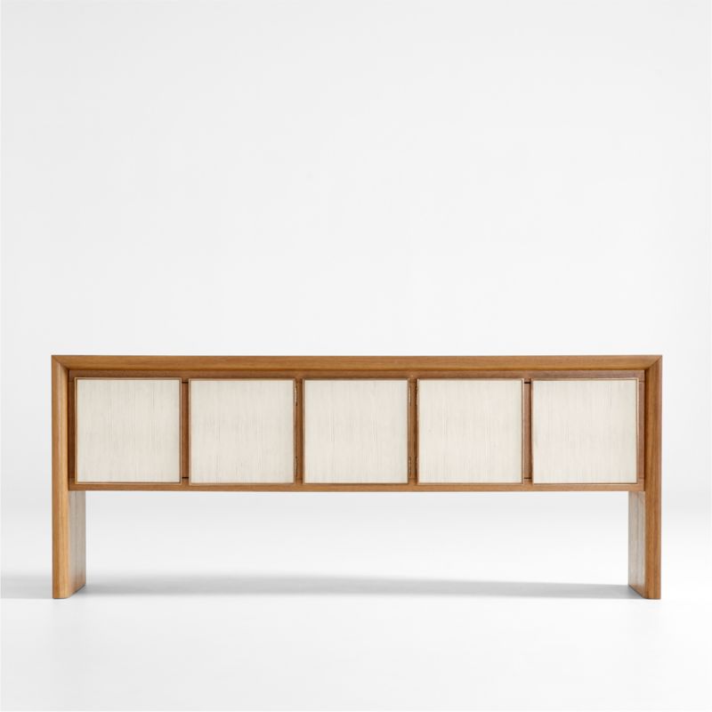 Framed in gleaming brass, ivory resin troweled by hand faces the doors of our Emma sideboard with the look of creamy plaster. The doors' delicate ribbed texture complements the fine grain of the solid oak and flaky white oak veneer frame, while the inlay top offers smooth contrast. Behind the center door hides a pair of drawers for storing silverware or table linens, while the remaining four doors conceal shelves ideal for dinnerware, barware and audio equipment. Whether used as a buffet, bar or media center, our exclusive Emma wood oak sideboard has a serene presence with exquisite craftsmanship.