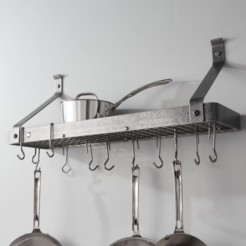 Authentically beautiful, endlessly useful. This multifunctional hammered steel rack comes in handy all over the house. In the kitchen, use the gridded shelf to corral your go-to ingredients and the 12 hooks to hang pans. In the garage, hand tools hang below a rack filled with jars of nails and screws. On the back porch, the shelf holds secret sauces and spice blends while grilling utensils hang from the hooks. Without plating, coating or painting, the timeless, authentic beauty of forged and hammered steel shines through. This sturdy rack is a small-space essential, adding storage, function, organization and personality to any wall.