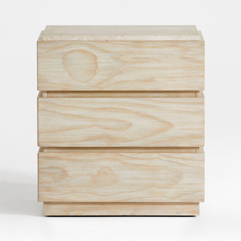 Refresh your bedroom decor with our breezy, coastal-inspired Ensenada nightstand. Flat-front drawers, grooved finger pulls and a plinth base put all the focus on the dynamic grain of pine veneer, enhanced by a light ceruse finish. A travertine top adds a bit of mix-material panache to the streamlined look. Ours exclusively, the nightstand pairs with the Ensenada dresser for a coordinated look.