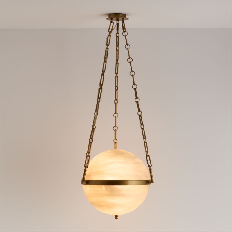 Adorn your ceiling with an ethereal sphere. A luminous globe of hand-blown milkglass with fascinating swirls is secured with a band and suspended from chain links, both crafted of burnished brass. Calling to mind ancient astrolabes, the pendant light casts a diffuse glow as it bestows a celestial presence overhead.