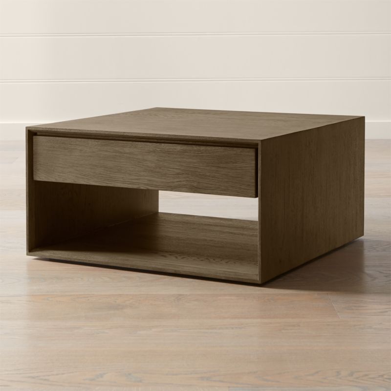 Our Ethan coffee table seamlessly integrates living room storage into a clean, modern design made of oak and oak veneer. A single, soft-closing drawer disguised as an apron opens to stash books, remotes and games. A spacious shelf below airs out the design, creating the perfect balance between open and closed space. The Ethan Square Coffee Table is a Crate and Barrel exclusive.