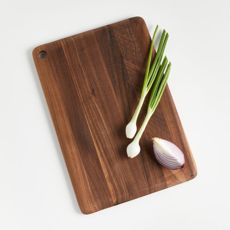 Gorgeous graining, subtly beveled edges and softly rounded corners upgrades the classic cutting board. Sturdy enough for prep work, the large walnut board doubles as a stunning serving piece for charcuterie, crudités and sliced breads. A generously proportioned hanging hole provides a sturdy carrying grip for passing appetizers and allows you to display this beauty at a jaunty angle. Pair the large walnut cutting board with its small and large counterparts for coordinated preparation and serving.