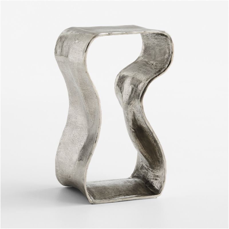 An undulating ribbon of cast aluminum gives fluid form to our Expressionist drink table. Designed as a continuous loop, the table shows off its organic swells and indentations with a cool and contemporary nickel patina finish. This eye-catching accent table tucks next to a sofa as a handy surface to set down a glass while also adding a dash of movement and artistic flair to the entire room.