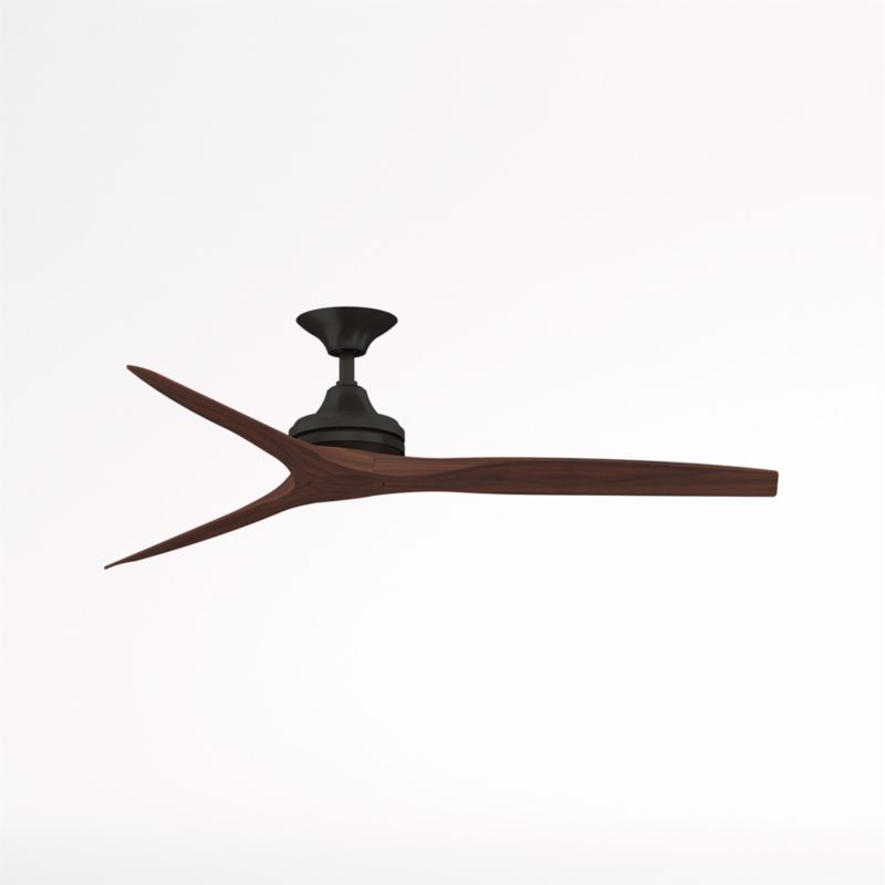 Inspired by a vintage propeller, this sophisticated fan brings its understated good looks to any room. The remote-controlled ceiling fan offers three speeds and reverses for seasonal use—counterclockwise in the summer, clockwise in the winter. Finished in dark bronze, the fan's streamlined metal fixture supports three wood blades stained a warm whiskey brown. Looking great in a range of decor styles, the fan is damp rated for installation in outdoor spaces as well.